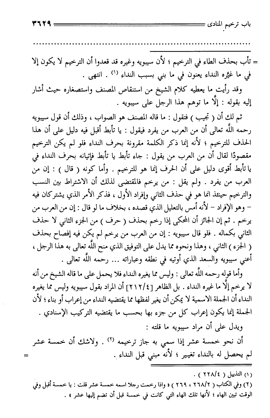 (¬2) وفي الكتاب (2/ 268، 269) «واذا رخمت رجلا اسمه خمسة عشر قلت: يا خمسة أقبل وفي الوقت تبين الهاء؛ لأنها تلك الهاء التي كانت في خمسة قبل أن تضم إليها عشر».