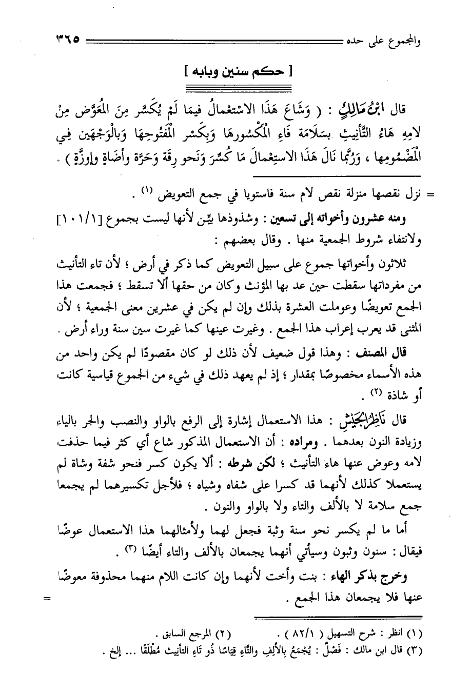 أما ما لم يكسر نحو سنة وثبة فجعل لهما ولأمثالهما هذا الاستعمال عوضا فيقال: سنون وثبون وسيأتي أنهما يجمعان بالألف والتاء أيضا (¬3).