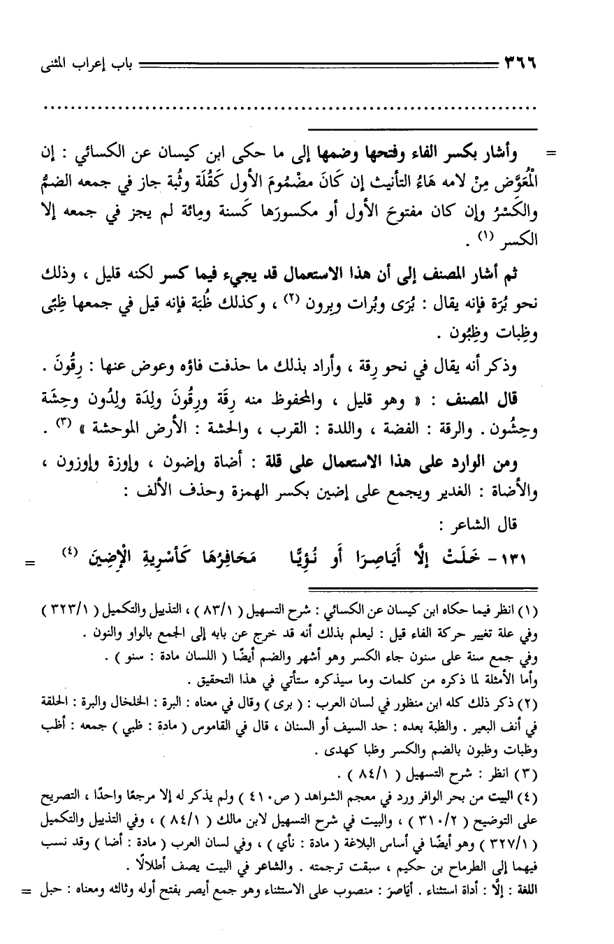(¬1) انظر فيما حكاه ابن كيسان عن الكسائي: شرح التسهيل (1/ 83)، التذييل والتكميل (1/ 323) وفي علة تغيير حركة الفاء قيل: ليعلم بذلك أنه قد خرج عن بابه إلى الجمع بالواو والنون.