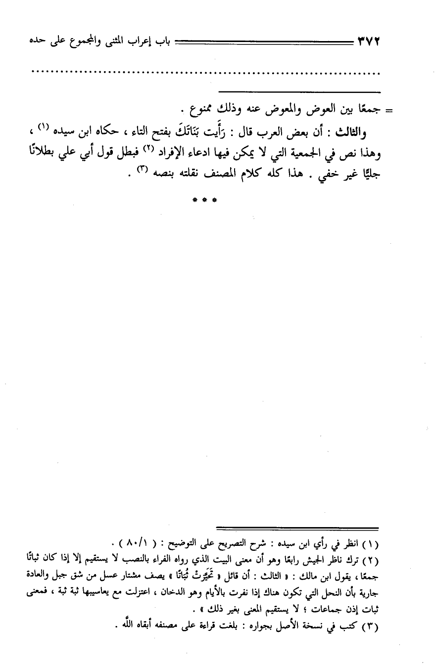 والثالث: أن بعض العرب قال: رأيت بناتك بفتح التاء، حكاه ابن سيده (¬1)، وهذا نص في الجمعية التي لا يمكن فيها ادعاء الإفراد (¬2) فبطل قول أبي علي بطلانا جليّا غير خفي. هذا كله كلام المصنف نقلته بنصه (¬3).