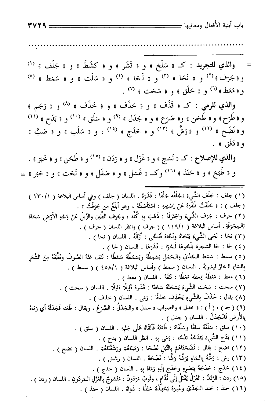 والذي للتجريد: كـ «سلخ» و «قشر» و «كشط» و «جلف» (¬1) و «جرف» (¬2) و «نحا» (¬3) و «لحا» (¬4) و «سلت» و «سمط» (¬5) و «معط» (¬6) و «حلق» و «سحت» (¬7).