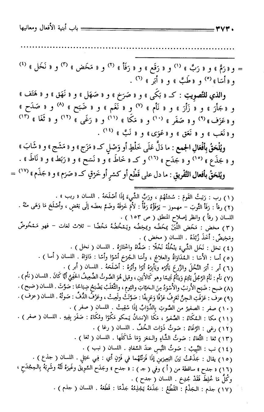 والذي للتّصويت: كـ «بكى» و «صرخ» و «صهل» و «نهق» و «هتف» و «جأر» و «زأر» و «نأم» (¬7) و «نغم» و «ضبح» (¬8) و «صدح» و «عزف» (¬9) و «صفر» (¬10) و «مكا» (¬11) و «رغى» (¬12) و «ثغا» (¬13) و «نعب» و «نعق» و «عوى» و «نبّ» (¬14).