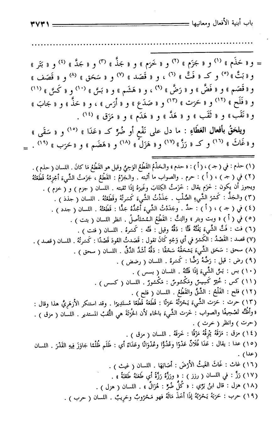 و «سحق» (¬8) و «قصف» و «قصم» و «فضّ» و «رضّ» (¬9)، و «هشم» و «بسّ» (¬10) و «كسّ» (¬11) و «فلح» (¬12) و «حرت» (¬13) و «صدع» و «أرس»، و «حذّ» و «جاب» و «نقب» و «ثقب» و «هدّ» و «هدم» و «مزق» (¬14).
