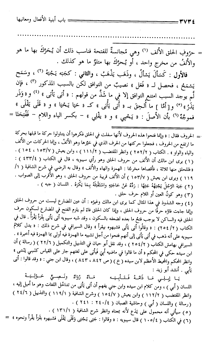 (¬4) وجه الشذوذ في هذا المثال كما يرى ابن مالك وغيره: أن عين المضارع ليست من حروف الحلق وإنما جاءت فاؤه حرفا من حروف الحلق، وإذا كان الحلق فاء لم يلزم الفتح في المضارع لسكون حرف الحلق فيه والساكن لا يوجب فتح ما بعده لضعفه بالسكون، وقد شبه سيبويه أبى يأبى بقرأ يقرأ. قال في الكتاب (2/ 254): «وقالوا أبى يأبى فشبهوه بيقرأ» وقال السيرافي في شرح ذلك: «يدل كلام سيبويه على أنه ذهب في أبى يأبى إلى أنهم فتحوا من أجل تشبيه ما الهمزة فيه أولى بما الهمزة فيه أخيرة».