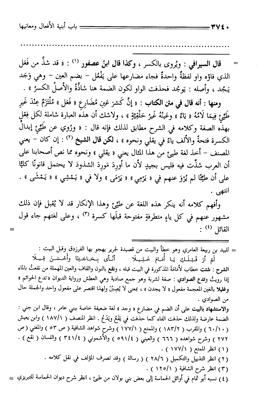 ومنها: أنه قال في متن الكتاب: «إنّ كسر عين مضارع «فعل» ملتزم عند غير طيّئ فيما لامه «ياء» وعينه غير حلقيّة»، ولا شك أن هذه العبارة شاملة لكل فعل بهذه الصفة وكلامه في الشرح مطابق لذلك فإنه قال: «وروي عن طيّئ إبدال الكسرة فتحة والألف ياء في يقلي ونحوه»، لكن قال الشيخ (¬2): إن كان - يعني المصنف - أخذ لغة طيئ من هذا المثال يعني «يقلي» ونحوه مما نص أصحابنا على أن العرب شذّت فيه فليس بجيد لأن ما أورد مورد الشذوذ لا يحتمل قانونا كليّا على أن طيّئا لم يرو عنهم في «يرمي» «يرمى» ولا في «يمشي» «يمشى».