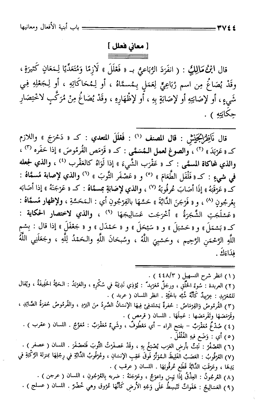 قال ناظر الجيش: قال المصنف (¬1): فعلل المتعدي: كـ «دحرج» واللازم كـ «عربد» (¬2)، والصوغ لعمل المسمّى: كـ «قرمص القرموص» إذا حفره (¬3)، والذي لمحاكاة المسمّى: كـ «عقرب الشّيء» إذا لواه كالعقرب (¬4)، والذي لجعله في شيء: كـ «فلفل الطّعام» (¬5) و «عصفر الثّوب» (¬6) والذي لإصابة مسمّاه: