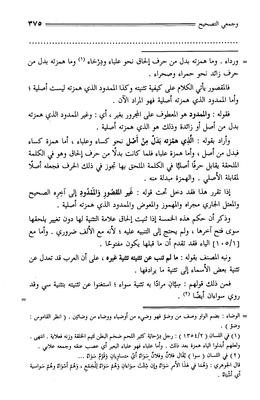 ورداء. وما همزته بدل من حرف إلحاق نحو علباء ودرحاء (¬1) وما همزته بدل من حرف زائد نحو حمراء وصحراء.
