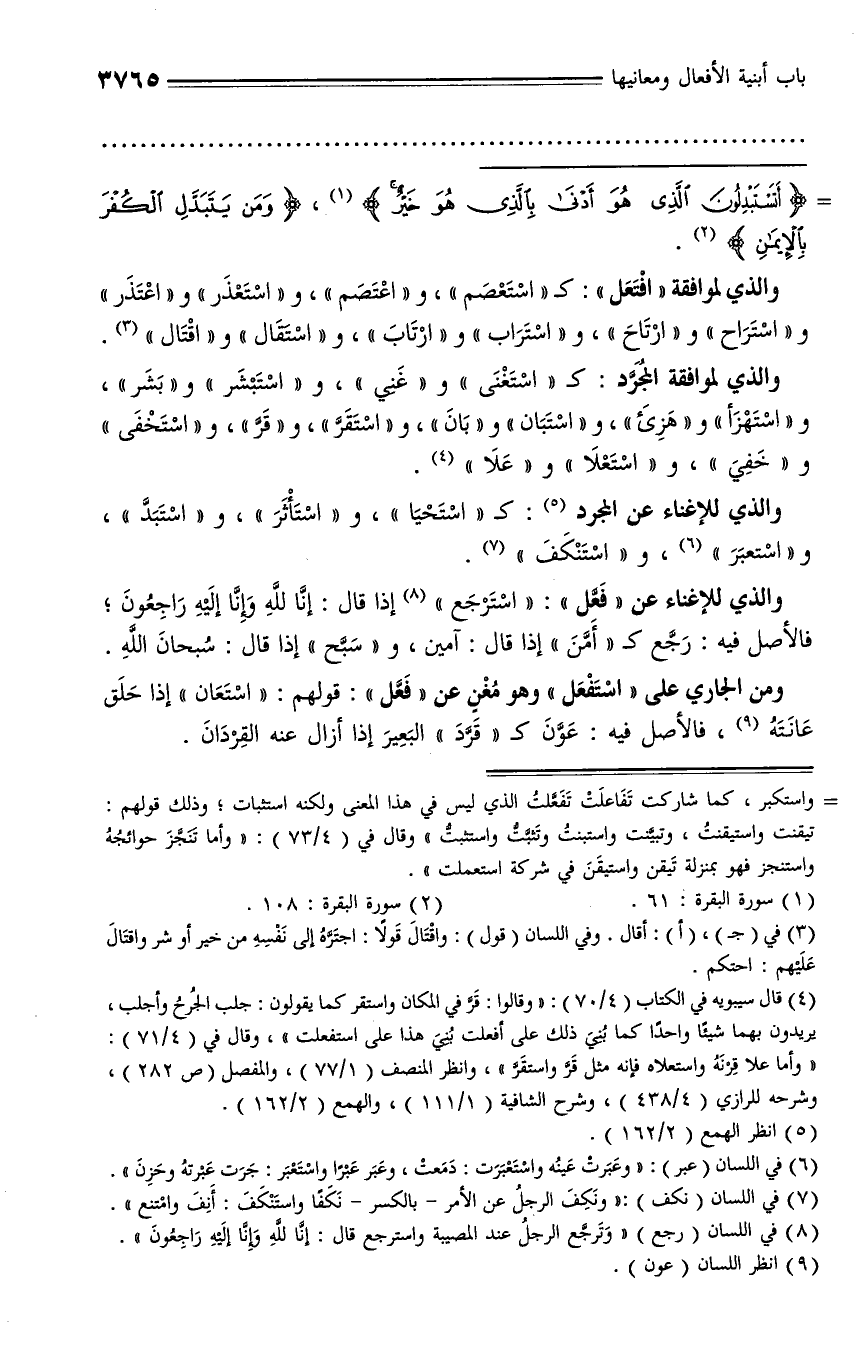 والذي للإغناء عن «فعّل»: «استرجع» (¬8) إذا قال: إِنَّا لِلَّهِ وَإِنَّا إِلَيْهِ راجِعُونَ؛ فالأصل فيه: رجّع كـ «أمّن» إذا قال: آمين، و «سبّح» إذا قال: سبحان الله.
