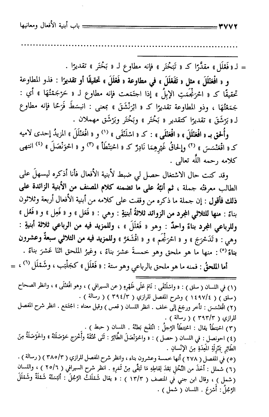 وألحق بـ «افعنلل» «افعنلى»: كـ «اسلنقى» (¬1) و «افعنلل» المزيد إحدى لاميه كـ «اقعنسس» (¬2) وإلحاق غيرهما نادر كـ «احبنطأ» (¬3) و «احونصل» (¬4) انتهى كلامه رحمه الله تعالى.
