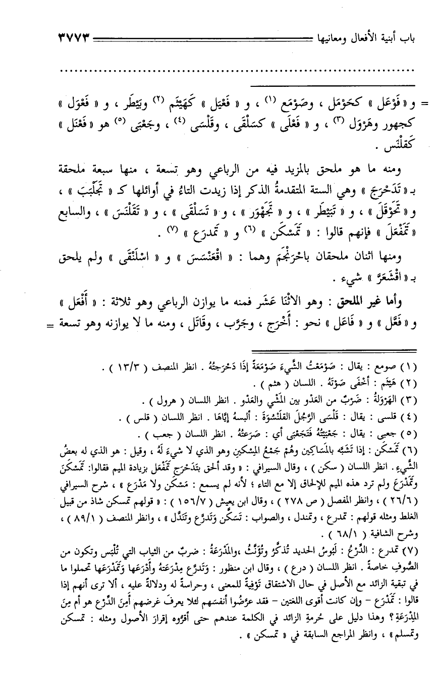 (¬6) تمسكن: إذا تشبّه بالمساكين وهم جمع المسكين وهو الذي لا شيء له، وقيل: هو الذي له بعض الشّيء. انظر اللسان (سكن)، وقال السيرافي: «وقد ألحق بتدحرج تمفعل بزيادة الميم فقالوا: تمسكن وتمدرع ولم ترد هذه الميم للإلحاق إلا مع التاء؛ لأنه لم يسمع: مسكن ولا مدرع»، شرح السيرافي (6/ 26)، وانظر المفصل (ص 278)، وقال ابن يعيش (7/ 156): «قولهم تمسكن شاذ من قبيل الغلط ومثله قولهم: تمدرع، وتمندل، والصواب: تسكّن وتدرّع وتندّل»، وانظر المنصف (1/ 89)، وشرح الشافية (1/ 68).