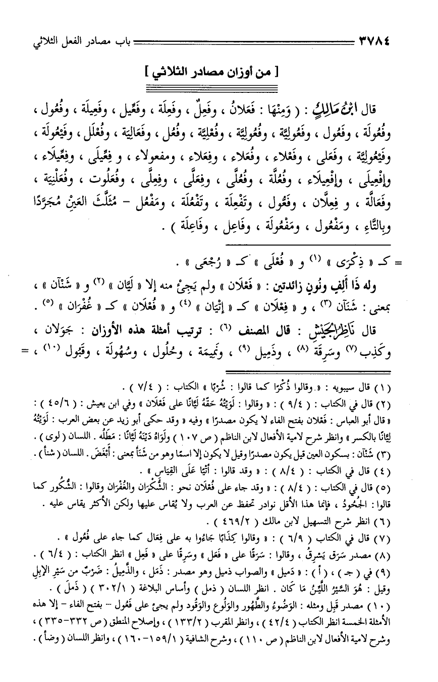 قال ناظر الجيش: قال المصنف (¬6): ترتيب أمثلة هذه الأوزان: جولان، وكذب (¬7) وسرقة (¬8)، وذميل (¬9)، ونميمة، وحلول، وسهولة، وقبول (¬10)، -