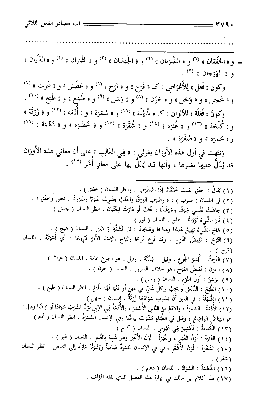 وكون «فعلة» للألوان: كـ «شهلة» (¬11) و «سمرة» و «أدمة» (¬12) و «زرقة» و «كلحة» (¬13) و «غبرة» (¬14) و «شقرة» (¬15) و «خضرة» و «دهمة» (¬16) و «حمرة» و «صفرة».