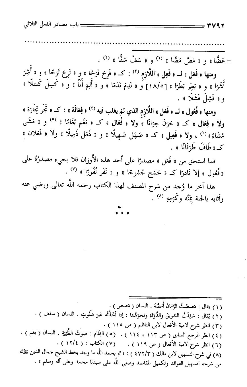 (¬8) في شرح التسهيل لابن مالك (3/ 472): «تم بحمد الله ما وجد بخط الشيخ جمال الدين رحمه الله من شرحه لتسهيل الفوائد وتكميل المقاصد وصلّى الله على سيدنا محمد وعلى آله وسلم».