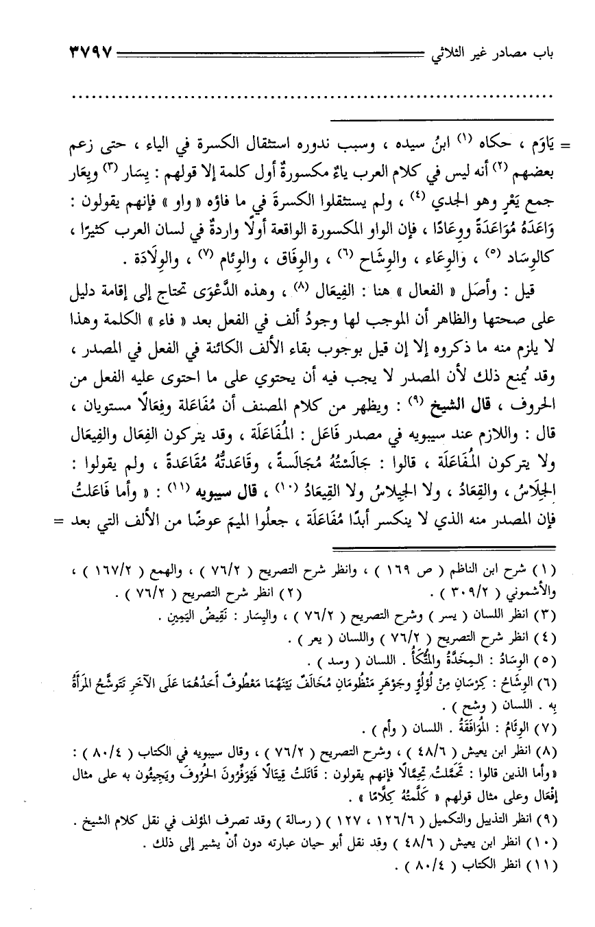قيل: وأصل «الفعال» هنا: الفيعال (¬8)، وهذه الدّعوى تحتاج إلى إقامة دليل على صحتها والظاهر أن الموجب لها وجود ألف في الفعل بعد «فاء» الكلمة وهذا لا يلزم منه ما ذكروه إلا إن قيل بوجوب بقاء الألف الكائنة في الفعل في المصدر، وقد يمنع ذلك لأن المصدر لا يجب فيه أن يحتوي على ما احتوى عليه الفعل من الحروف، قال الشيخ (¬9): ويظهر من كلام المصنف أن مفاعلة وفعالا مستويان، قال: واللازم عند سيبويه في مصدر فاعل: المفاعلة، وقد يتركون الفعال والفيعال ولا يتركون المفاعلة، قالوا: جالسته مجالسة، وقاعدتّه مقاعدة، ولم يقولوا:
