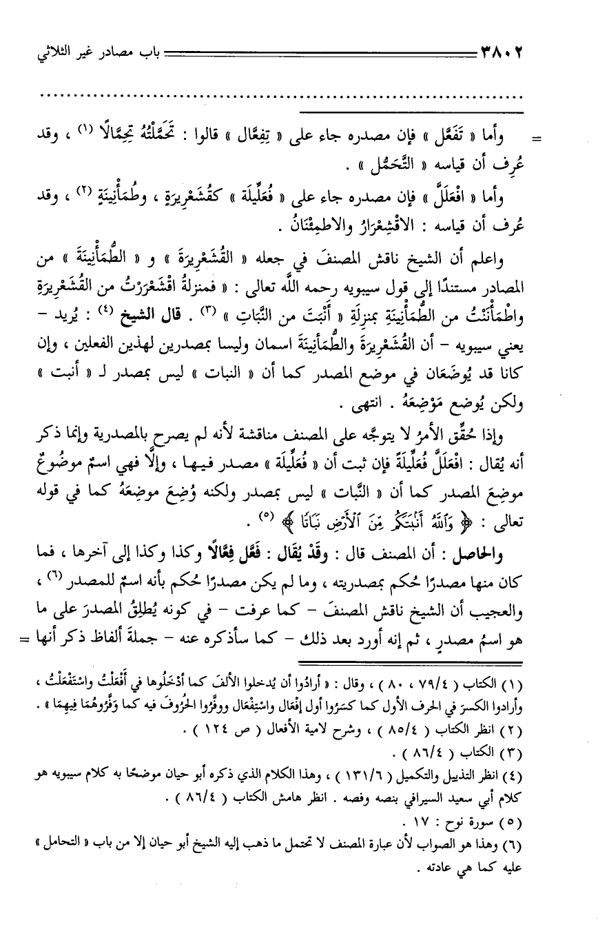 واعلم أن الشيخ ناقش المصنف في جعله «القشعريرة» و «الطّمأنينة» من المصادر مستندا إلى قول سيبويه رحمه الله تعالى: «فمنزلة اقشعررت من القشعريرة واطمأننت من الطّمأنينة بمنزلة «أنبت من النّبات» (¬3). قال الشيخ (¬4): يريد - يعني سيبويه - أن القشعريرة والطّمأنينة اسمان وليسا بمصدرين لهذين الفعلين، وإن كانا قد يوضعان في موضع المصدر كما أن «النبات» ليس بمصدر لـ «أنبت» ولكن يوضع موضعه. انتهى.