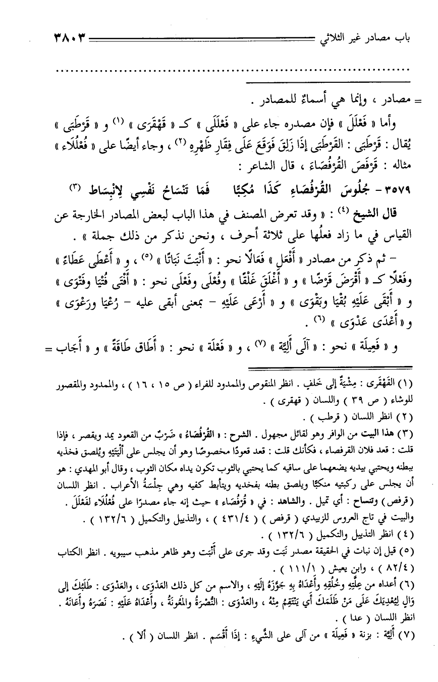 قال الشيخ (¬4): «وقد تعرض المصنف في هذا الباب لبعض المصادر الخارجة عن القياس في ما زاد فعلها على ثلاثة أحرف، ونحن نذكر من ذلك جملة».