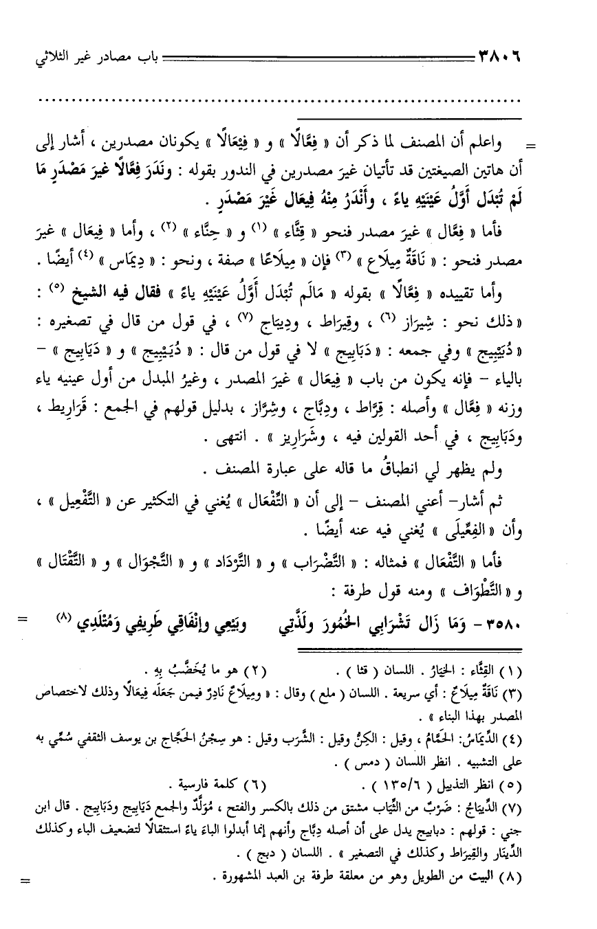 «دبيبيج» وفي جمعه: «دبابيج» لا في قول من قال: «دييبيج» و «ديابيج» - بالياء - فإنه يكون من باب «فيعال» غير المصدر، وغير المبدل من أول عينيه ياء وزنه «فعّال» وأصله: قرّاط، ودبّاج، وشرّاز، بدليل قولهم في الجمع: قراريط، ودبابيج، في أحد القولين فيه، وشراريز». انتهى.