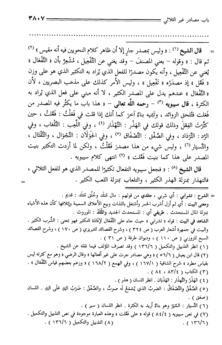 قال الشيخ (¬8): «فجعل سيبويه التفعال تكثيرا للمصدر الذي هو للفعل الثلاثي، فالتهذار بمنزلة الهذر الكثير،
