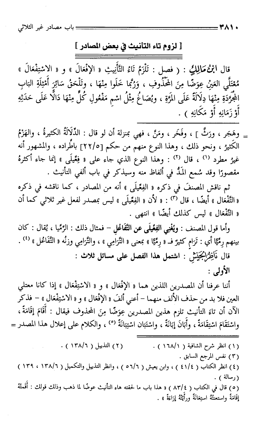 قال ابن مالك: (فصل: تلزم تاء التّأنيث «الإفعال» و «الاستفعال» معتلّي العين عوضا من المحذوف، وربّما خلوا منها، وتلحق سائر أمثلة الباب المجرّدة منها دلالة على المرّة، ويصاغ مثل اسم مفعول كلّ منها دالّا على حدثه أو زمانه أو مكانه).