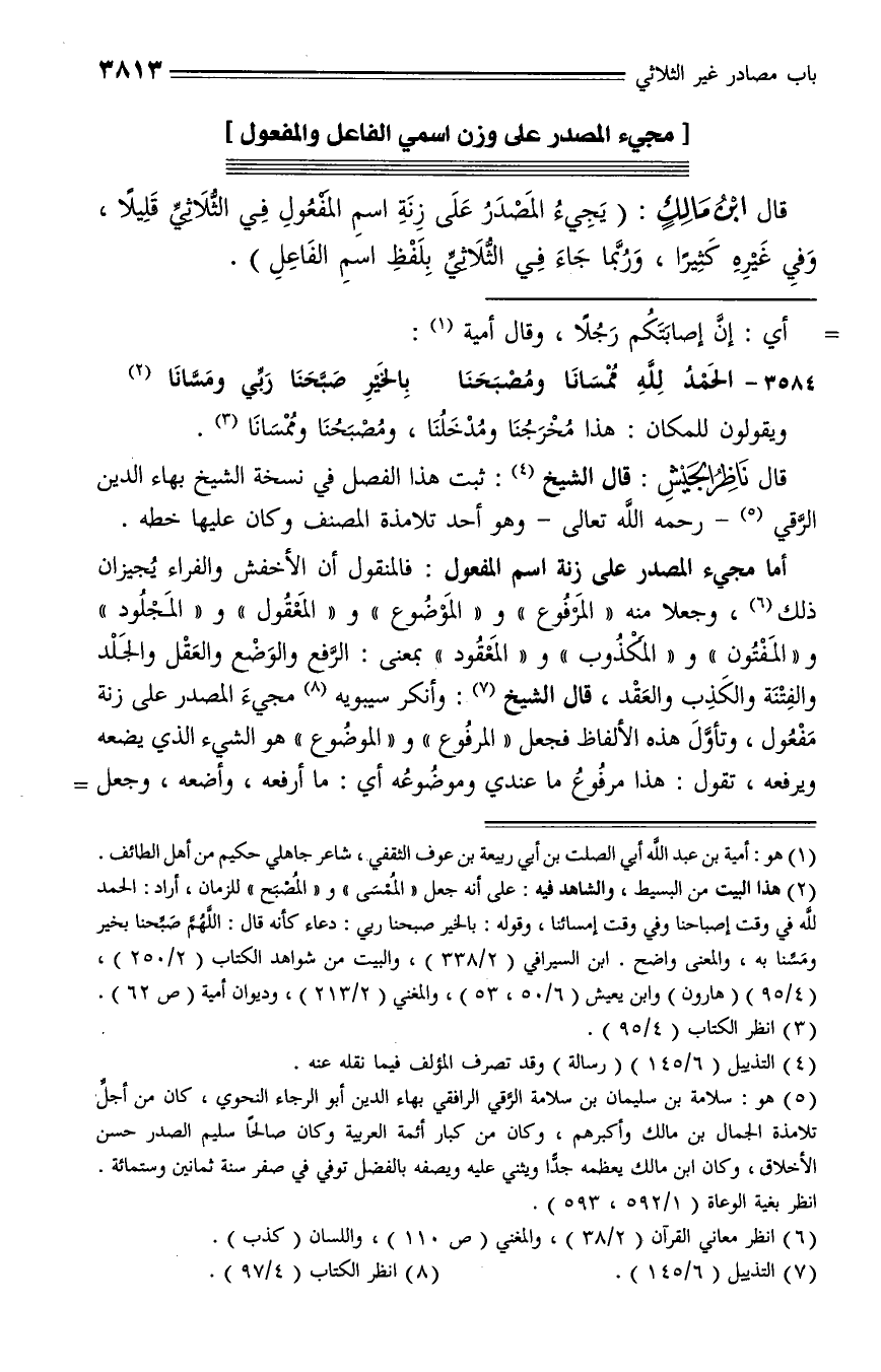 (¬5) هو: سلامة بن سليمان بن سلامة الرّقي الرافقي بهاء الدين أبو الرجاء النحوي، كان من أجلّ تلامذة الجمال بن مالك وأكبرهم، وكان من كبار أئمة العربية وكان صالحا سليم الصدر حسن الأخلاق، وكان ابن مالك يعظمه جدّا ويثني عليه ويصفه بالفضل توفي في صفر سنة ثمانين وستمائة.