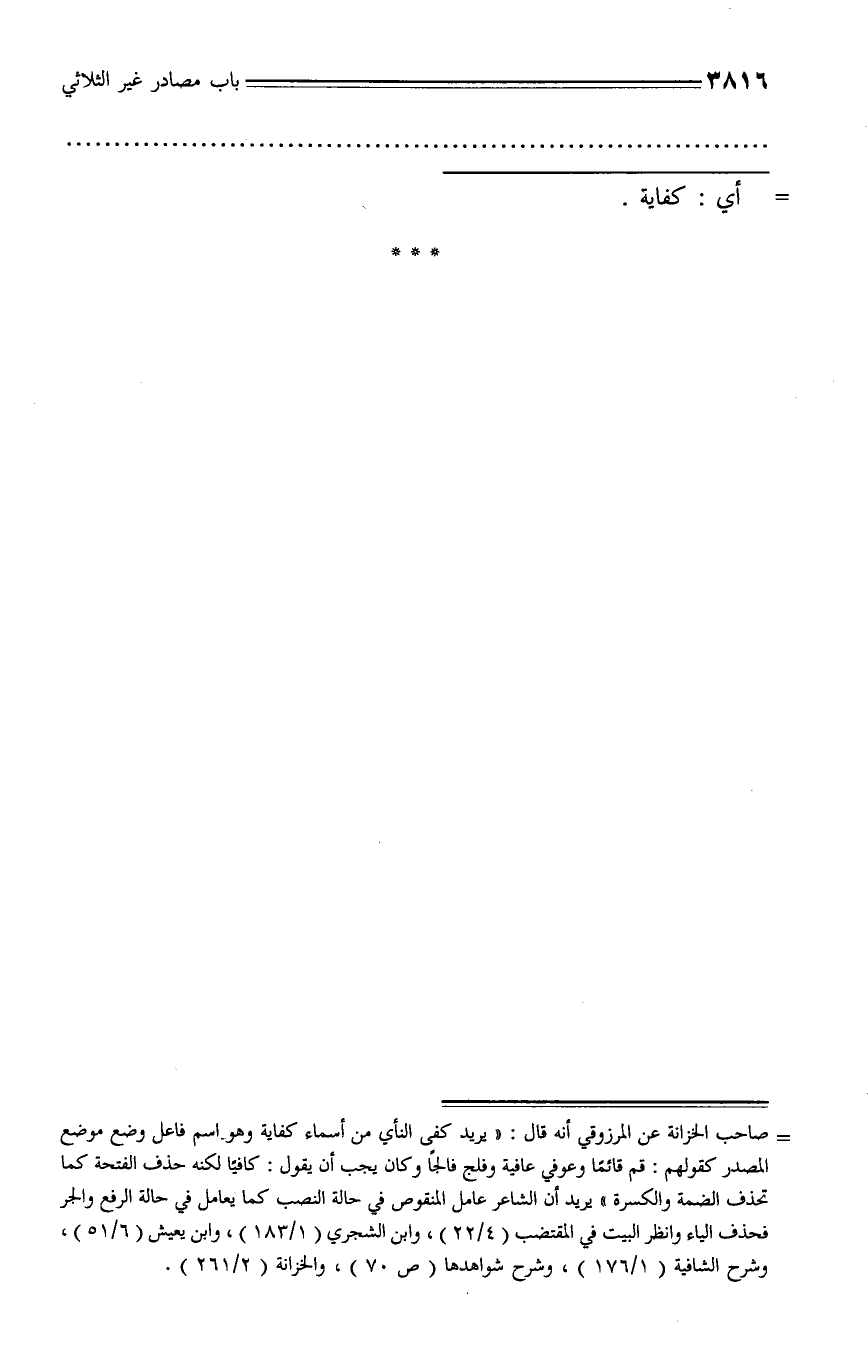 = صاحب الخزانة عن المرزوقي أنه قال: «يريد كفى النأي من أسماء كفاية وهو اسم فاعل وضع موضع المصدر كقولهم: قم قائما وعوفي عافية وفلج فالجا وكان يجب أن يقول: كافيا لكنه حذف الفتحة كما تحذف الضمة والكسرة» يريد أن الشاعر عامل المنقوص في حالة النصب كما يعامل في حالة الرفع والجر فحذف الياء وانظر البيت في المقتضب (4/ 22)، وابن الشجري (1/ 183)، وابن يعيش (6/ 51)، وشرح الشافية (1/ 176)، وشرح شواهدها (ص 70)، والخزانة (2/ 261).