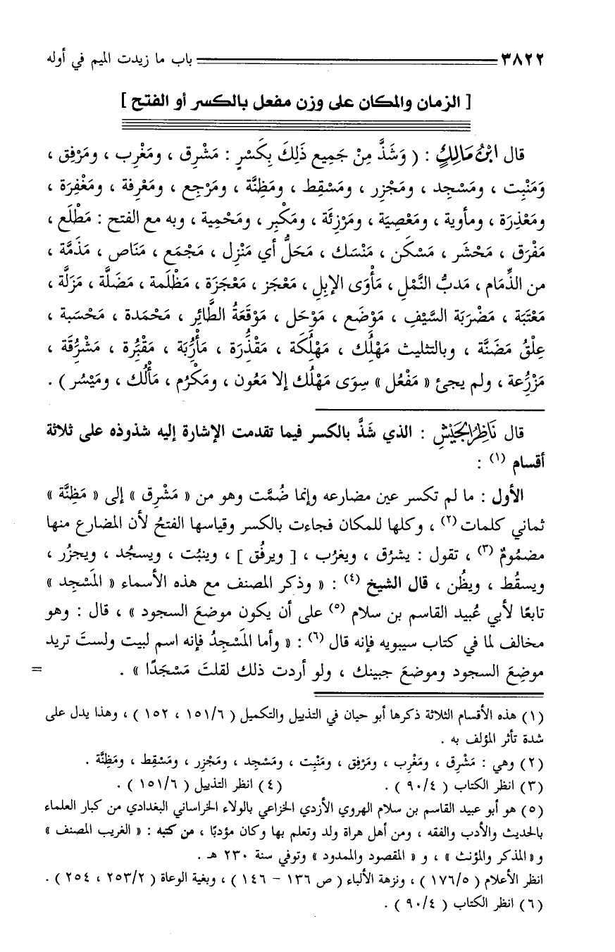 (¬5) هو أبو عبيد القاسم بن سلام الهروي الأزدي الخزاعي بالولاء الخراساني البغدادي من كبار العلماء بالحديث والأدب والفقه، ومن أهل هراة ولد وتعلم بها وكان مؤدبا، من كتبه: «الغريب المصنف» و «المذكر والمؤنث»، و «المقصود والممدود» وتوفي سنة 230 هـ.