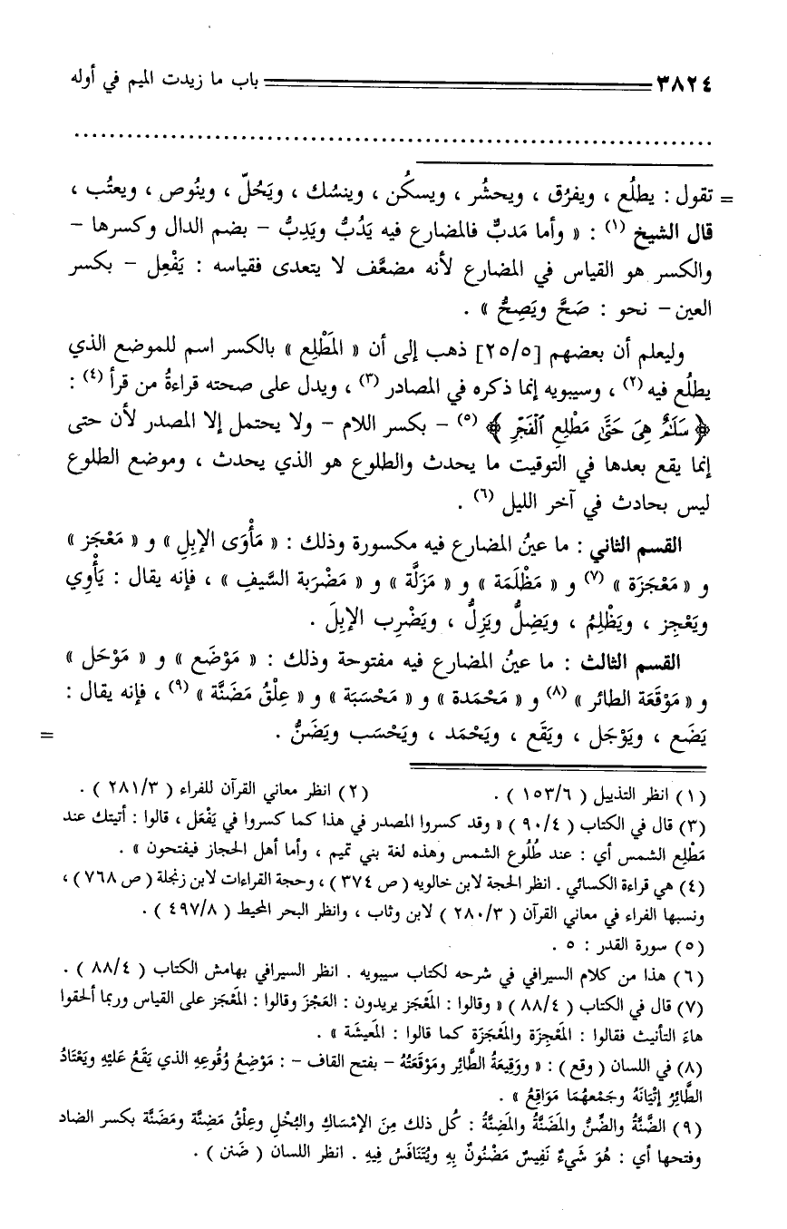 وليعلم أن بعضهم [5/ 25] ذهب إلى أن «المطلع» بالكسر اسم للموضع الذي يطلع فيه (¬2)، وسيبويه إنما ذكره في المصادر (¬3)، ويدل على صحته قراءة من قرأ (¬4):