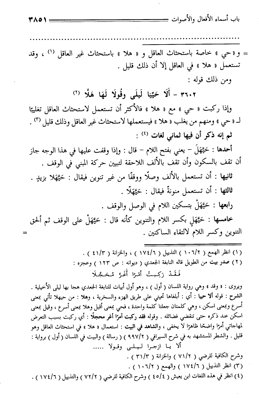 وإذا ركبت «حي» مع «هلا» فالأكثر أن تستعمل لاستحثاث العاقل تغليبا لـ «حي» ومنهم من يغلب «هلا» فيستعملها لاستحثاث غير العاقل وذلك قليل (¬3).