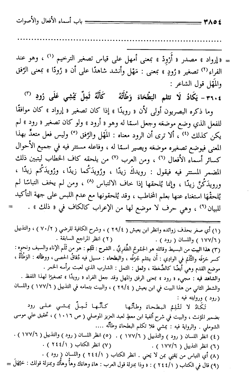 وما ذكره البصريون أولى لأن «رويدا» إذا كان تصغير «إرواد» كان موافقا للفعل الذي وضع موضعه وجعل اسما له وهو «أرود» ولو كان تصغير «رود» لم يكن كذلك (¬4)، ألا ترى أن الرود معناه: المهل والرّفق (¬5) وليس فعل متعدّ بهذا المعنى فيوضع تصغيره موضعه ويصير اسما له، وفاعله مستتر فيه في جميع الأحوال كسائر أسماء الأفعال (¬6)، ومن العرب (¬7) من يلحقه كاف الخطاب ليتبين ذلك المضمر المستتر فيه فيقول: رويدك زيدا،