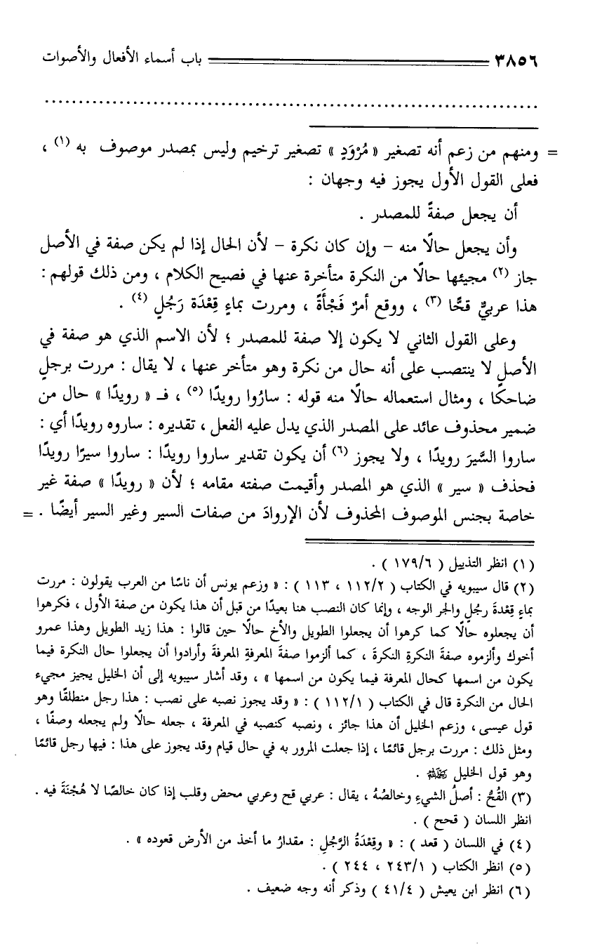 وعلى القول الثاني لا يكون إلا صفة للمصدر؛ لأن الاسم الذي هو صفة في الأصل لا ينتصب على أنه حال من نكرة وهو متأخر عنها، لا يقال: مررت برجل ضاحكا، ومثال استعماله حالا منه قوله: ساروا رويدا (¬5)، فـ «رويدا» حال من ضمير محذوف عائد على المصدر الذي يدل عليه الفعل، تقديره: ساروه رويدا أي: