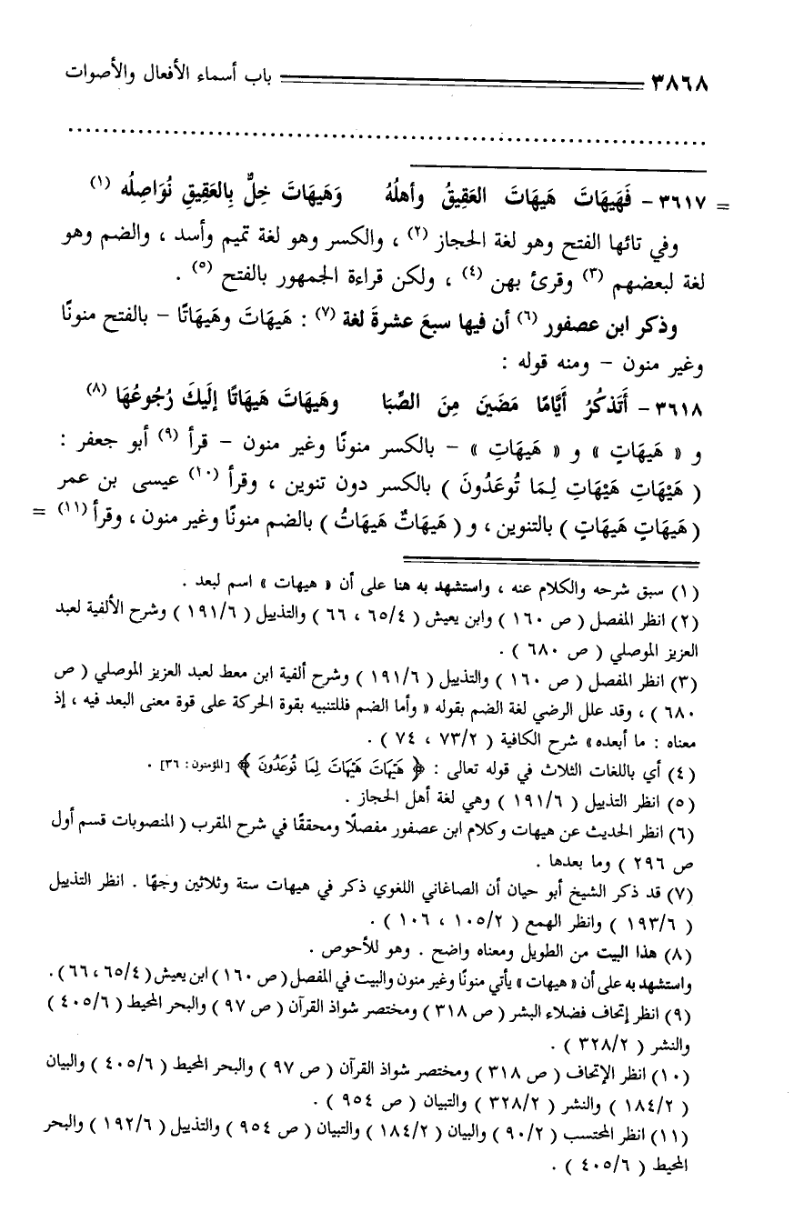 (¬7) قد ذكر الشيخ أبو حيان أن الصاغاني اللغوي ذكر في هيهات ستة وثلاثين وجها. انظر التذييل (6/ 193) وانظر الهمع (2/ 105، 106).