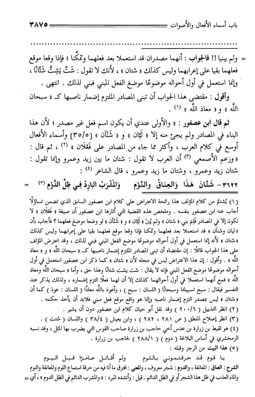 أول أحواله موضوعا موضع الفعل المبني فإنه لا يقال: شت يشت شتانا وهذا حق، وأما «سبحان الله ومعاذ الله» فمع أنهما استعملا في أول أحوالهما كذلك إلا أن لهما فعلا التزم إضماره، ولذلك يذكر عند التفسير فيقال: سبح تسبيحا وسبحانا (اللسان: سبح)، وأعوذ بالله معاذا (اللسان: عوذ) كما أن «شتان» ليس بمصدر التزم إضمار ناصبه وإنما هو واقع موقع فعل مبني فلا بد أن يأخذ حكمه.