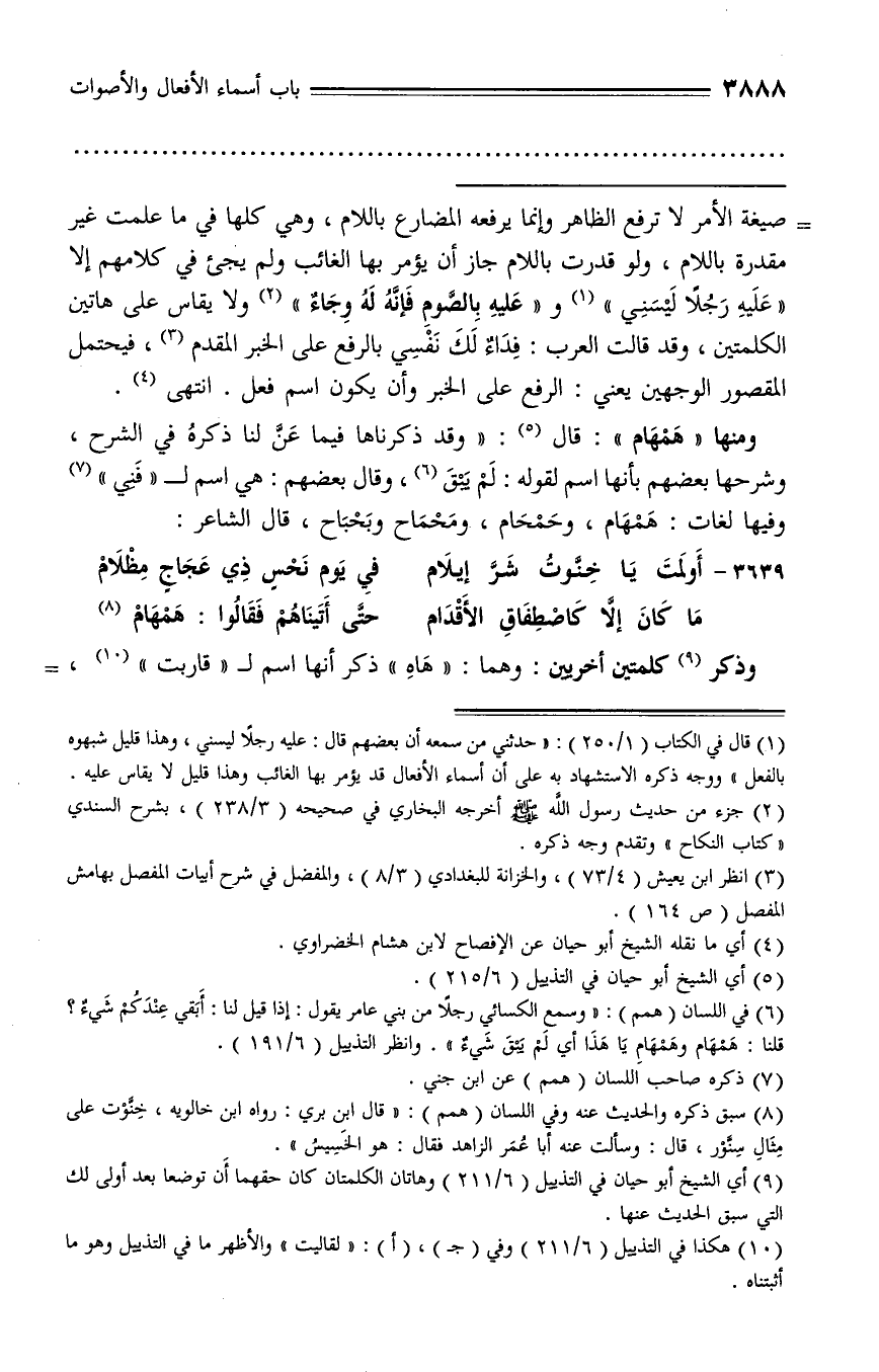 ومنها «همهام»: قال (¬5): «وقد ذكرناها فيما عنّ لنا ذكره في الشرح، وشرحها بعضهم بأنها اسم لقوله: لم يبق (¬6)، وقال بعضهم: هي اسم لـ «فني» (¬7) وفيها لغات: همهام، وحمحام، ومحماح وبحباح، قال الشاعر: