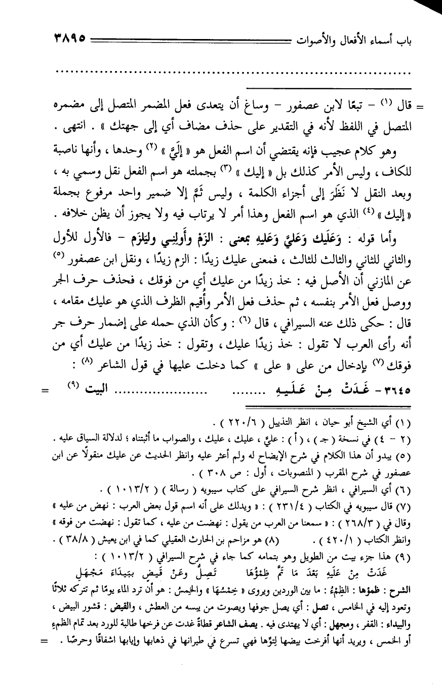 وأما قوله: وعليك وعليّ وعليه بمعنى: الزم وأولني وليلزم - فالأول للأول والثاني للثاني والثالث للثالث، فمعنى عليك زيدا: الزم زيدا، ونقل ابن عصفور (¬5) عن المازني أن الأصل فيه: خذ زيدا من عليك أي من فوقك، فحذف حرف الجر ووصل فعل الأمر بنفسه، ثم حذف فعل الأمر وأقيم الظرف الذي هو عليك مقامه، قال: حكى ذلك عنه السيرافي، قال (¬6): وكأن الذي حمله على إضمار حرف جر أنه رأى العرب لا تقول: خذ زيدا عليك، وتقول: خذ زيدا من عليك أي من فوقك (¬7) بإدخال من على «على» كما دخلت عليها في قول الشاعر (¬8):