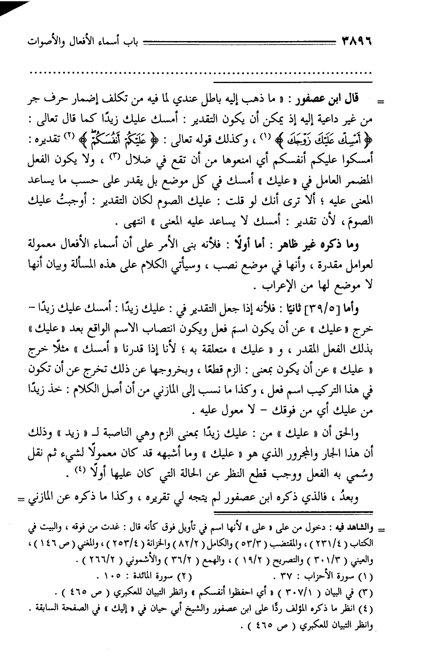 وأما [5/ 39] ثانيا: فلأنه إذا جعل التقدير في: عليك زيدا: أمسك عليك زيدا - خرج «عليك» عن أن يكون اسم فعل ويكون انتصاب الاسم الواقع بعد «عليك» بذلك الفعل المقدر، و «عليك» متعلقة به؛ لأنا إذا قدرنا «أمسك» مثلا خرج «عليك» عن أن يكون بمعنى: الزم قطعا، وبخروجها عن ذلك تخرج عن أن تكون في هذا التركيب اسم فعل، وكذا ما نسب إلى المازني من أن أصل الكلام: خذ زيدا من عليك أي من فوقك - لا معول عليه.