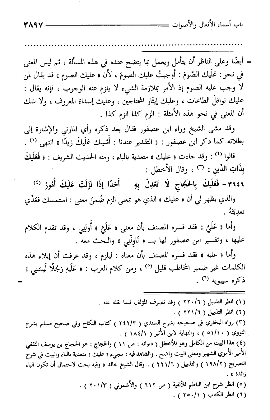 (¬4) هذا البيت من الكامل وهو للأخطل (ديوانه: ص 11) والحجاج: هو الحجاج بن يوسف الثقفي الأمير الأموي الشهير ومعنى البيت واضح. والشاهد فيه: مجيء «عليك» متعدية بالباء والبيت في شرح التصريح (2/ 198) والتذييل (6/ 221). وقال الشيخ خالد «وفيه بحث لاحتمال أن تكون الباء زائدة».