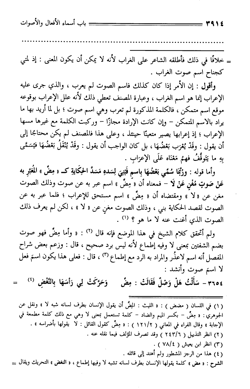 وأما قوله: وربّما سمّي بعضها باسم فبني لسده مسدّ الحكاية كـ «مضّ» المعبّر به عن صوت مغن عن لا - فمعناه أن «مضّ» اسم عبر به عن صوت وذلك الصوت مغن عن «لا» ومقتضاه أن «مضّ» اسم مستحق للإعراب؛ فلما عبر به عن الصوت لقصد الحكاية بني، وذلك الصوت مغن عن «لا»، لكن لم يعرف ذلك الصوت الذي أغنت عنه لا ما هو؟ (¬1).