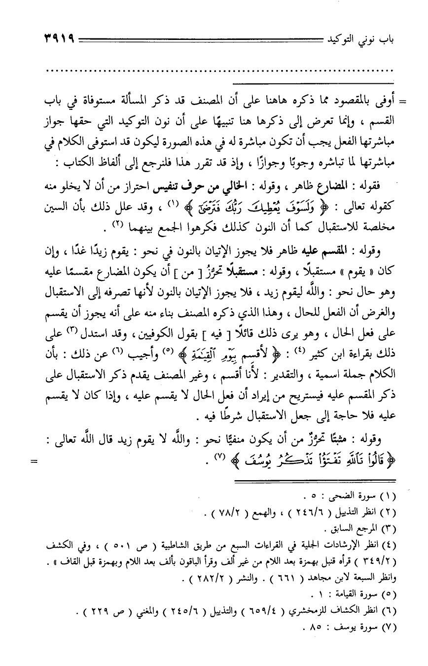 فقوله: المضارع ظاهر، وقوله: الخالي من حرف تنفيس احتراز من أن لا يخلو منه كقوله تعالى: وَلَسَوْفَ يُعْطِيكَ رَبُّكَ فَتَرْضى (¬1)، وقد علل ذلك بأن السين مخلصة للاستقبال كما أن النون كذلك فكرهوا الجمع بينهما (¬2).