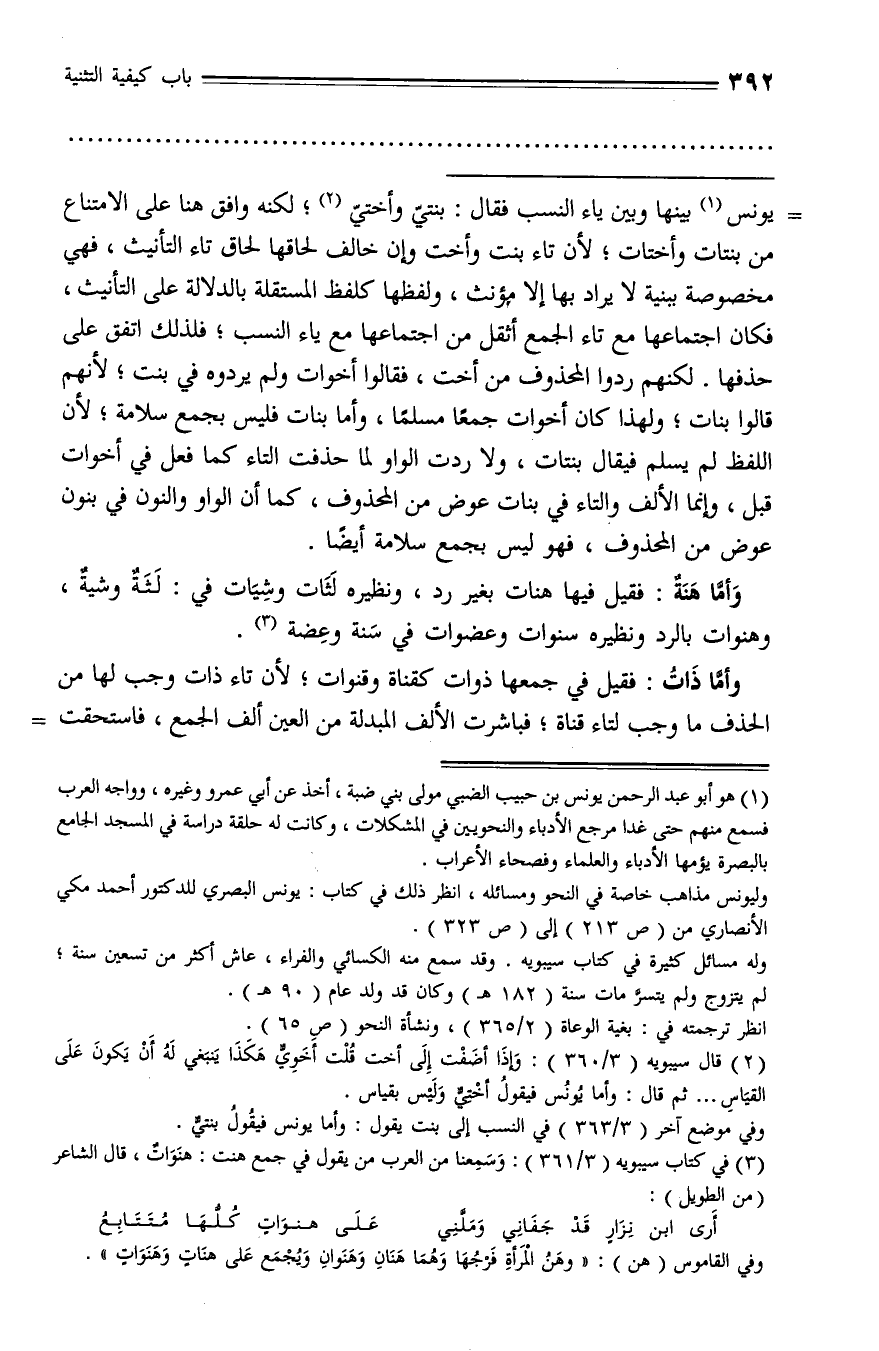 يونس (¬1) بينها وبين ياء النسب فقال: بنتيّ وأختيّ (¬2)؛ لكنه وافق هنا على الامتناع من بنتات وأختات؛ لأن تاء بنت وأخت وإن خالف لحاقها لحاق تاء التأنيث، فهي مخصوصة ببنية لا يراد بها إلا مؤنث، ولفظها كلفظ المستقلة بالدلالة على التأنيث، فكان اجتماعها مع تاء الجمع أثقل من اجتماعها مع ياء النسب؛ فلذلك اتفق على حذفها. لكنهم ردوا المحذوف من أخت، فقالوا أخوات ولم يردوه في بنت؛ لأنهم قالوا بنات؛ ولهذا كان أخوات جمعا مسلما، وأما