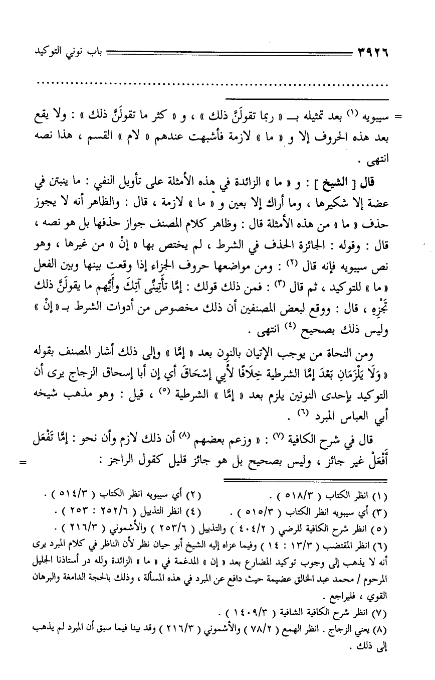 (¬6) انظر المقتضب (3/ 13: 14) وفيما عزاه إليه الشيخ أبو حيان نظر لأن الناظر في كلام المبرد يرى أنه لا يذهب إلى وجوب توكيد المضارع بعد «إن» المدغمة في «ما» الزائدة ولله در أستاذنا الجليل المرحوم/ محمد عبد الخالق عضيمة حيث دافع عن المبرد في هذه المسألة، وذلك بالحجة الدامغة والبرهان القوي، فليراجع.