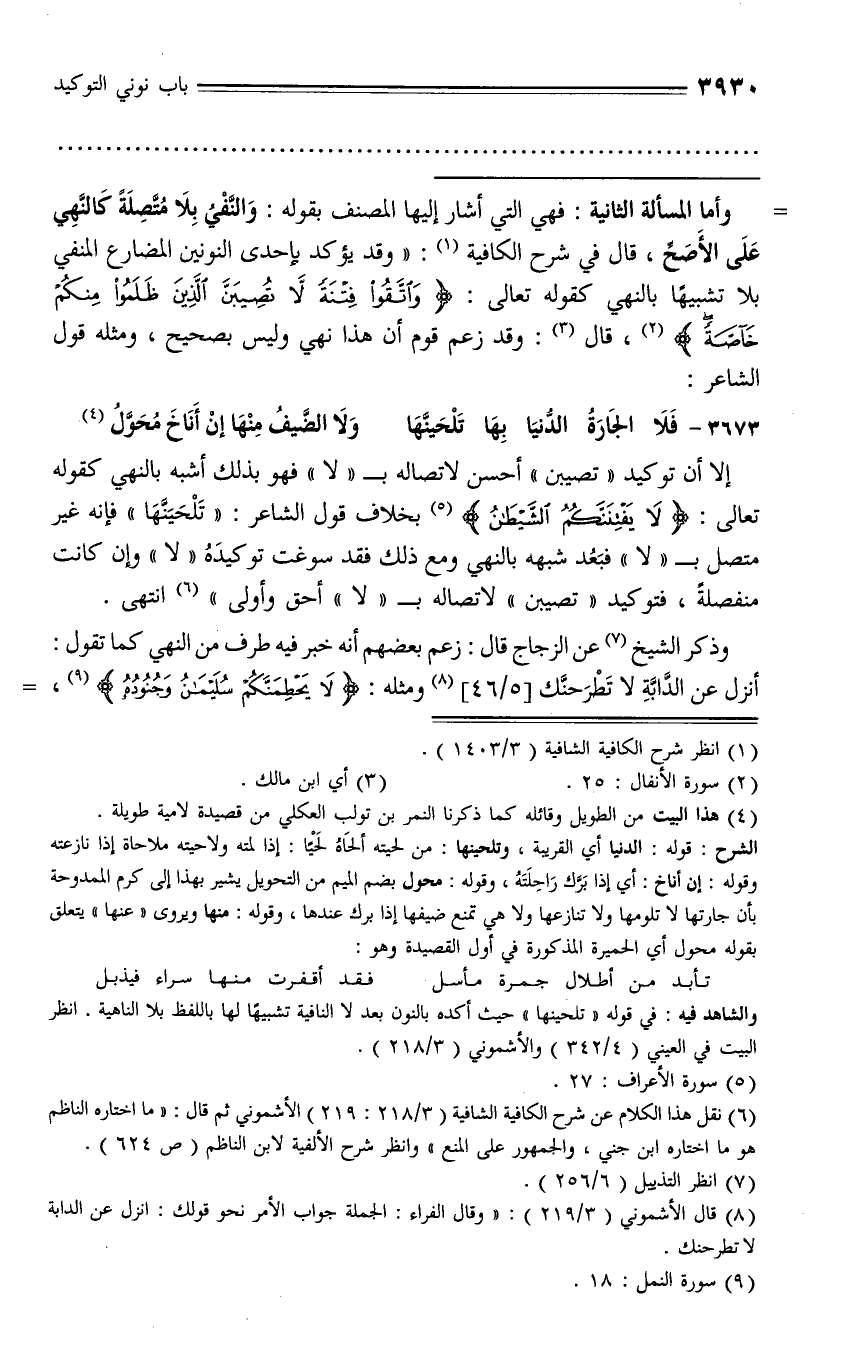 وأما المسألة الثانية: فهي التي أشار إليها المصنف بقوله: والنّفي بلا متّصلة كالنّهي على الأصحّ، قال في شرح الكافية (¬1): «وقد يؤكد بإحدى النونين المضارع المنفي بلا تشبيها بالنهي كقوله تعالى: وَاتَّقُوا فِتْنَةً لا تُصِيبَنَّ الَّذِينَ ظَلَمُوا مِنْكُمْ خَاصَّةً (¬2)، قال (¬3): وقد زعم قوم أن هذا نهي وليس بصحيح، ومثله قول الشاعر: