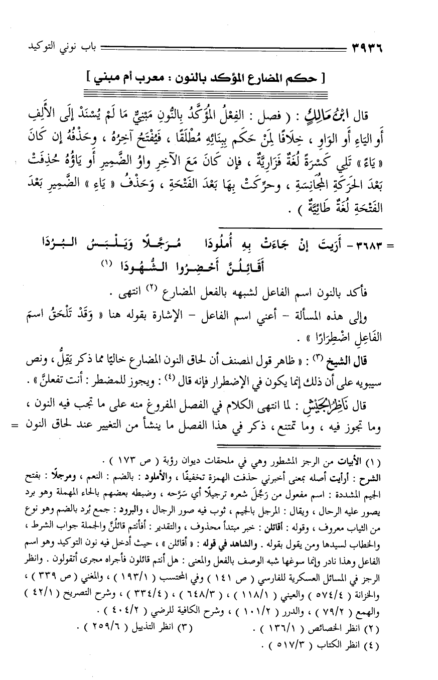 قال ابن مالك: (فصل: الفعل المؤكّد بالنّون مبنيّ ما لم يسند إلى الألف أو الياء أو الواو، خلافا لمن حكم ببنائه مطلقا، فيفتح آخره، وحذفه إن كان «ياء» تلي كسرة لغة فزاريّة، فإن كان مع الآخر واو الضّمير أو ياؤه حذفت بعد الحركة المجانسة، وحرّكت بها بعد الفتحة، وحذف «ياء» الضّمير بعد الفتحة لغة طائيّة).