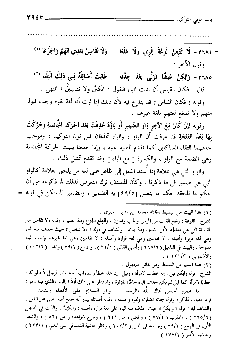 الشرح: قوله وابكن قيل: إنه خطاب لامرأة، وقيل: إن هذا خطأ والصواب أنه خطاب لرجل لأنه لو كان خطابا لامرأة كما قيل لم يكن حذف الياء خاصّا بفزارة، واستدلوا على ذلك أيضا بالبيت الذي قبله وهو: