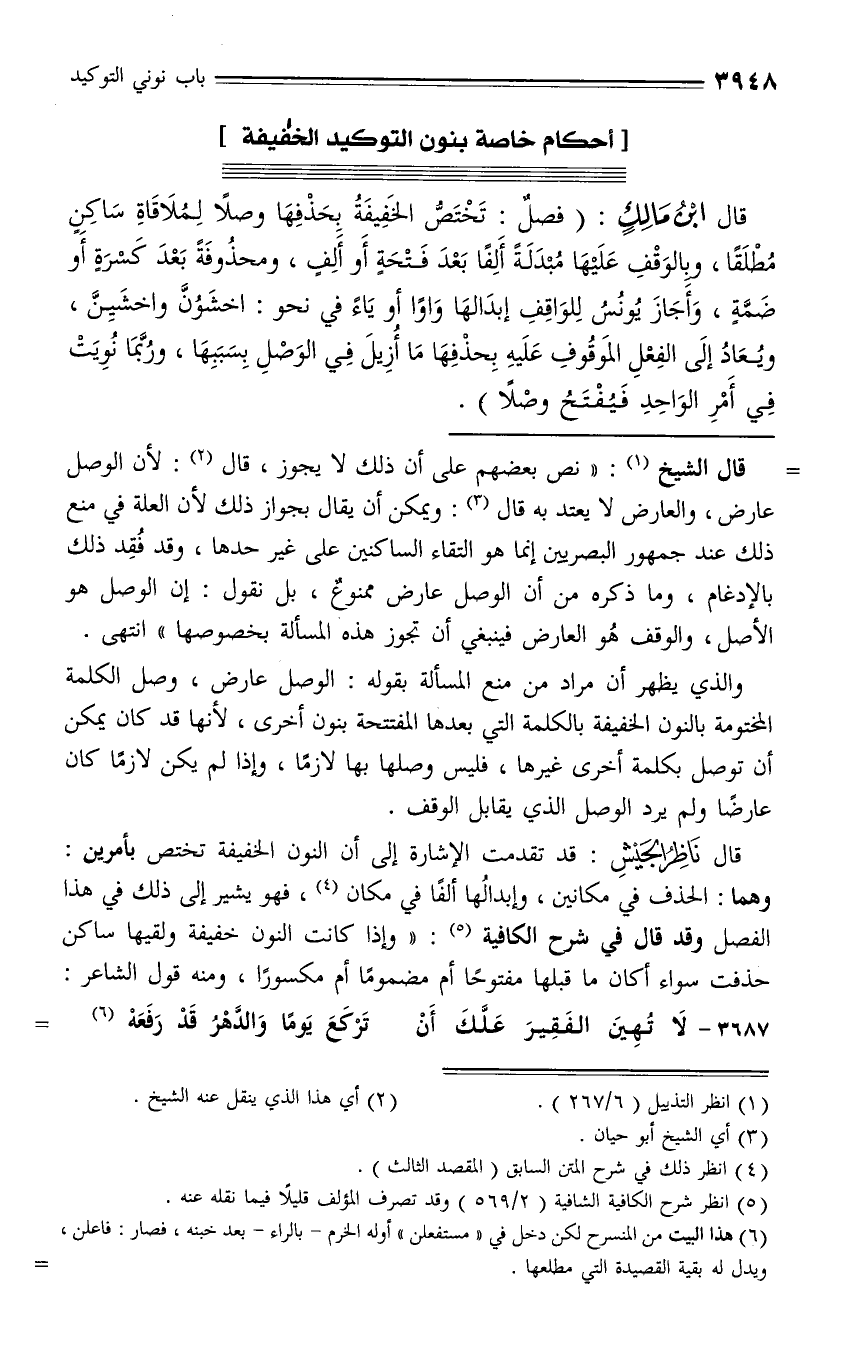 وهما: الحذف في مكانين، وإبدالها ألفا في مكان (¬4)، فهو يشير إلى ذلك في هذا الفصل وقد قال في شرح الكافية (¬5): «وإذا كانت النون خفيفة ولقيها ساكن حذفت سواء أكان ما قبلها مفتوحا أم مضموما أم مكسورا، ومنه قول الشاعر: