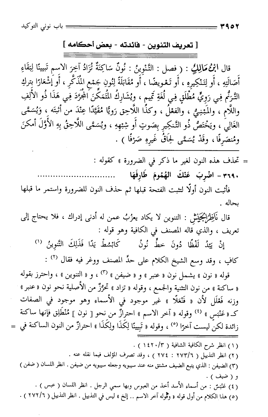 قال ابن مالك: (فصل: التّنوين: نون ساكنة تزاد آخر الاسم تبيينا لبقاء أصالته، أو لتنكيره، أو تعويضا، أو مقابلة لنون جمع المذكّر، أو إشعارا بترك التّرنّم في رويّ مطلق في لغة تميم، ويشارك المتمكّن المجرّد في هذا ذو الألف واللّام، والمبنيّ، والفعل، وكذا اللّاحق رويّا مقيّدا عند من أثبته، ويسمّى الغالي، ويختصّ ذو التّنكير بصوت أو شبهه، ويسمّى اللّاحق به الأوّل أمكن ومنصرفا، وقد يسمّى لحاق غيره صرفا).
