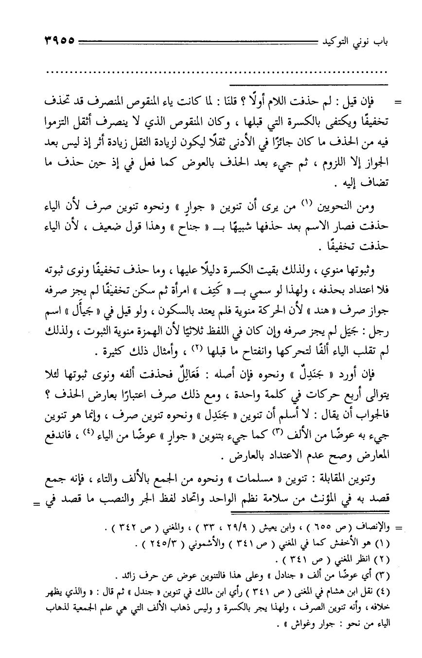 (¬4) نقل ابن هشام في المغنى (ص 341) رأي ابن مالك في تنوين «جندل» ثم قال: «والذي يظهر خلافه، وأنه تنوين الصرف، ولهذا يجر بالكسرة وليس ذهاب الألف التي هي علم الجمعية لذهاب الياء من نحو: جوار وغواش».