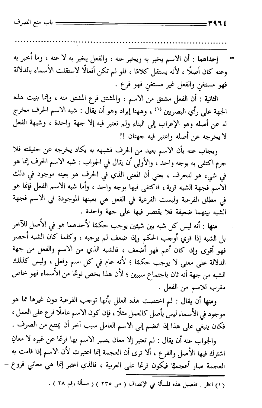 منها: أنه ليس كل شبه بين شيئين يوجب حكما لأحدهما هو في الأصل للآخر بل الشبه إذا قوي أوجب الحكم وإذا ضعف لم يوجبه، وكلما كان الشبه أحصر فهو أقوى وإذا كان أعم فهو أضعف، فالشبه الذي من الاسم والفعل من جهة الدلالة على معنى لا يوجب حكما؛ لأنه عام في كل اسم وفعل، وليس كذلك الشبه من جهة أنه ثان باجتماع سببين؛ لأن هذا يخص نوعا من الأسماء فهو خاص مقرب للاسم من الفعل.