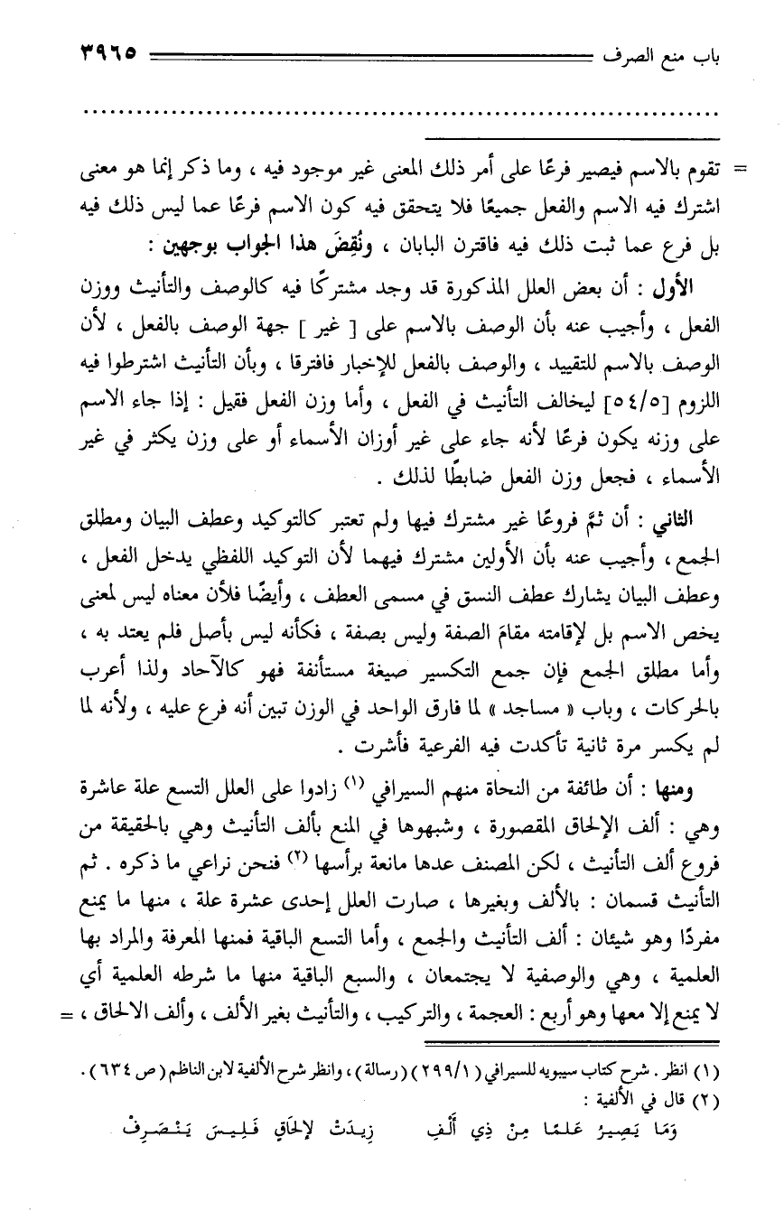 ومنها: أن طائفة من النحاة منهم السيرافي (¬1) زادوا على العلل التسع علة عاشرة وهي: ألف الإلحاق المقصورة، وشبهوها في المنع بألف التأنيث وهي بالحقيقة من فروع ألف التأنيث، لكن المصنف عدها مانعة برأسها (¬2) فنحن نراعي ما ذكره. ثم التأنيث قسمان: بالألف وبغيرها، صارت العلل إحدى عشرة علة، منها ما يمنع مفردا وهو شيئان: ألف التأنيث والجمع، وأما التسع الباقية فمنها المعرفة والمراد بها العلمية، وهي والوصفية لا يجتمعان، والسبع الباقية منها ما شرطه العلمية أي لا يمنع إلا معها وهو أربع: العجمة، والتركيب، والتأنيث بغير الألف، وألف الالحاق، -