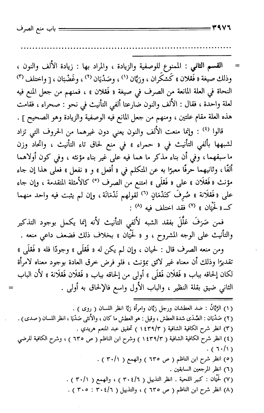 القسم الثاني: الممنوع للوصفية والزيادة، والمراد بها: زيادة الألف والنون، وذلك صيغة «فعلان» كسكران، وريّان (¬1)، وصديان (¬2)، وغضبان، [واختلف (¬3) النحاة في العلة المانعة من الصرف في صيغة «فعلان»، فمنهم من جعل المنع فيه لعلة واحدة، فقال: الألف والنون ضارعتا ألفي التأنيث في نحو: صحراء، فقامت هذه العلة مقام علتين، ومنهم من جعل المانع فيه الوصفية والزيادة وهو الصحيح].