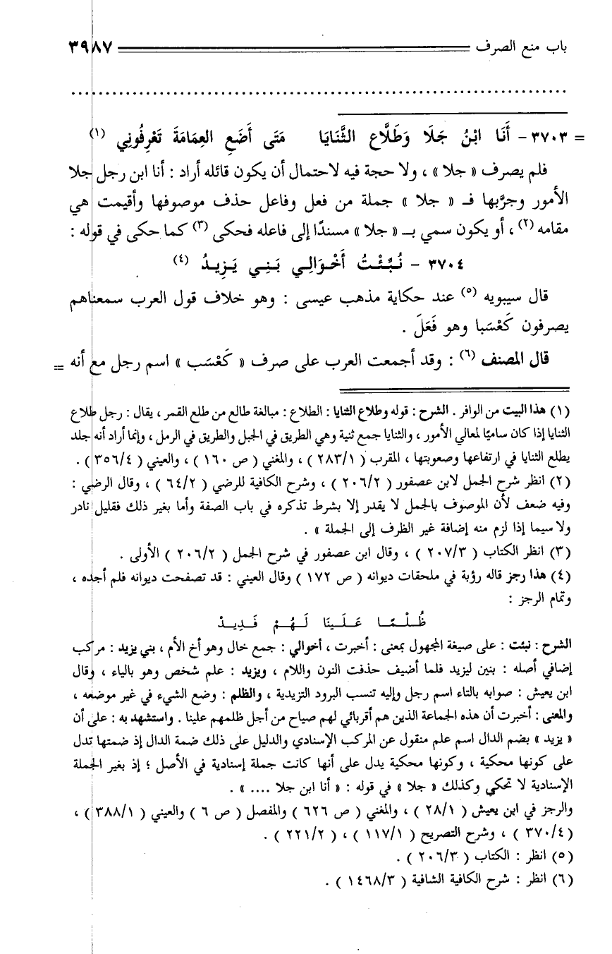 فلم يصرف «جلا»، ولا حجة فيه لاحتمال أن يكون قائله أراد: أنا ابن رجل جلا الأمور وجرّبها فـ «جلا» جملة من فعل وفاعل حذف موصوفها وأقيمت هي مقامه (¬2)، أو يكون سمي بـ «جلا» مسندا إلى فاعله فحكى (¬3) كما حكى في قوله: